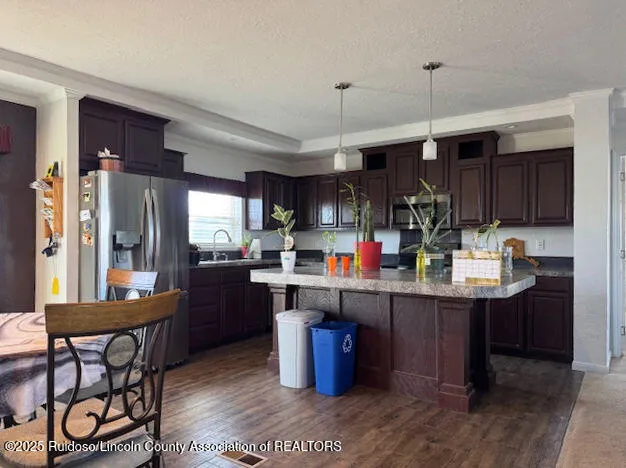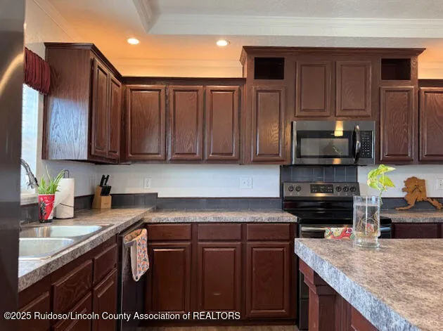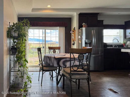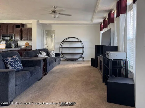 Three bedroom, 2.5 bath Solitaire manufactured home on 5 acres in Valle Del Sol (Carrizozo) surrounded by mountains. Open floor plan for a spacious look and split floor plan for privacy. Front porch to enjoy big mountain views. Two storage units – 10×12 Tuff Shed and 14X32 Graceland lofted cabin. Fenced fruit orchard designed to keep the pronghorn at bay. Fenced garden for the plant enthusiast. Fairly new roof.
